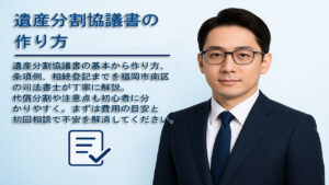 遺産分割協議書の基本から作り方、条項例、相続登記までを福岡市南区の司法書士が丁寧に解説。代償分割や注意点も初心者に分かりやすく。まずは費用の目安と初回相談で不安を解消してください。