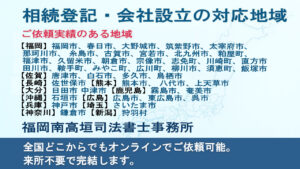 福岡市南区大橋の福岡南高垣司法書士事務所が、相続登記・不動産登記・遺言書作成・会社設立などの対応地域をわかりやすく解説。オンラインや郵送で全国からのご依頼にも対応しています。専門家が丁寧にサポートいたします。